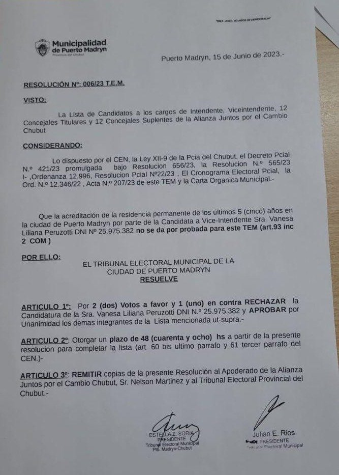 EL TEM se expidió respecto a la acusación de un vecino quien denunció que Peruzotti no cumplía con los últimos cinco años de residencia en Puerto Madryn. Luego de haber solicitado la documentación y haberla analizado, la resolución del TEM señala que “la acreditación de la residencia permanente de los últimos 5 años en Puerto Madryn por parte de la Candidata a Vice-Intendente Sra. Vanesa Liliana Peruzotti no se da por aprobada para este T.E.M. (Artículo 93, inciso 2, de la Carta Orgánica Municipal)”.