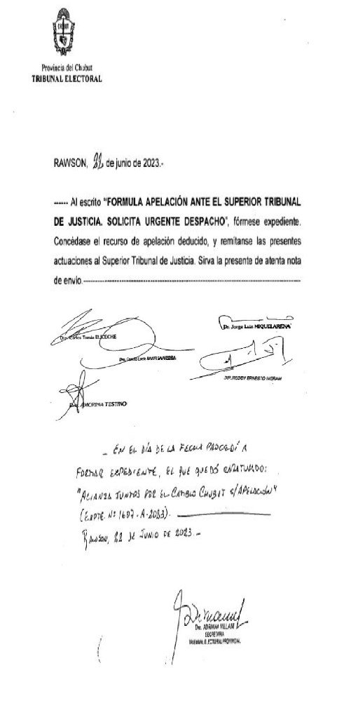 El Tribunal Electoral Provincial (TEP) autorizó a Juntos por el Cambio (JxC) el despacho de la apelación ante el Superior Tribunal de Justicia de Chubut debido sobre el fallo del organismo encargado de organizar los comicios del 30 de julio, donde se rechazó la adhesión de boletas de los partidos Renovación y Desarrollo y el partido Crecer de Lago Puelo.