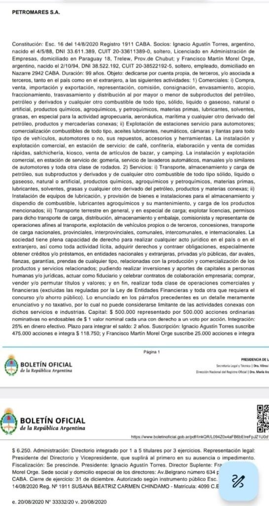 Además, tal como figura en la inscripción detallada del 2020 en el boletín oficial, la firma se realizó con 475.000 acciones para Torres y apenas 25.000 para Francisco Martín Morel Orge, por lo que hoy en día, el 95% de Petromares SA es del senador.