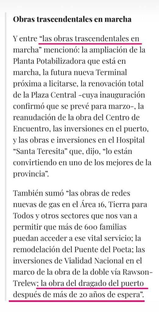 El intendente de Rawson, Damián Biss, anunció el dragado como una obra fundamental de su gestión. Lo hizo ante los vecinos y medios de prensa que asistieron a la apertura de sesiones legislativas en febrero de este año.