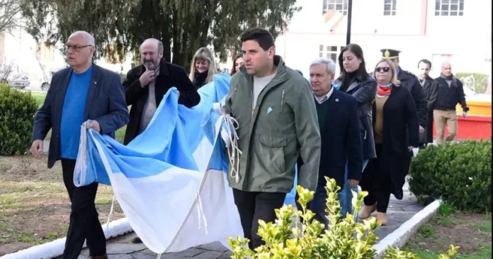 En la plaza central se llevó a cabo el acto donde se izó el pabellón nacional, se cantó el himno y se hizo entrega de placas a los comercios más antiguos de la localidad, finalizando con las palabras de Olivero.