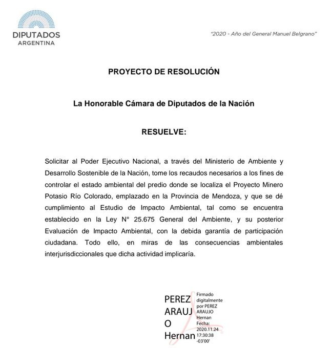 “Debido a las consecuencias ambientales interjurisdiccionales que Potasio Río Colorado ocasionará, reiteramos nuestro pedido (2020) de Estudio de Impacto Ambiental conforme Ley de Ambiente y su posterior Evaluación, con debida garantía de participación ciudadana en la cuenca”, reclamó Pérez Araujo a través de un tuit.
