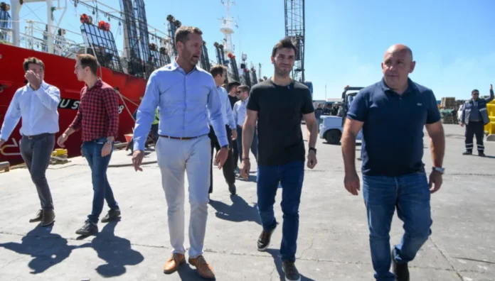 El gobernador de Chubut, Ignacio Torres, y el intendente de Puerto Madryn, Gustavo Sastre, recorrieron las instalaciones del Muelle “Almirante Storni”, donde se estaba llevando a cabo una importante descarga de calamar. En dicha oportunidad, ambos destacaron la importancia del Puerto para la matriz productiva local y provincial.